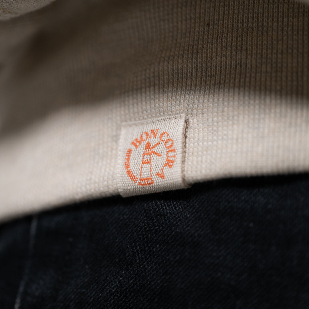 BONCOURAが創り出す本気の吊り裏毛生地 デニムと同じく原綿の配合から糸の捻までこだわったこだわりの釣り裏毛 原綿の種類産地によって質感、手触り、色などが変わってきます。 それを組み合わせて理想の生地に仕上げていきます。 色や杢感にはかなりこだわりがありどこにも無いものを作り上げようとサンプルに取り掛かったのですが、驚くことに色のたった1%の配合が変わると全然違った色味になってきます。 たかが1%されど1%、色味と杢感を決める最重要なファクターであり妥協できない 何度も繰り返し原綿の配合率を変え糸を作りサンプルを編み立てていき狙った色を出すまでにひたすら試行錯誤を行いました。 さらに難しいのが、できた糸だけを使って仮で編み立てしたとしても、 ある程度の色はわかりますが吊り編みで編み立てた場合裏毛の色も表地に関わってくるので、実際に吊り編み機で編んでみないと分からない点にもあります。 最終ジャッジは自分の感性と経験を信じて創り上げました。 生地の色に深みを持たせるために複数の色を混ぜてその色を表現しています。よく驚かれますがグレー杢の色を出すのにグレーの色を一切使っておらず、ほかにも独自の杢感を出すために原綿の段階、混合の段階でも様々な工夫を行なっています。 貴重な旧式の吊り編み機を使用、通常でも1日約10mしか進みませんが さらにその中でも特殊な手間をかけることにより1日7mしか生地が作れません これはB O N C O U R Aの定番のパーカーに換算すると1日4着も取れない量です。 非効率ではあるがそこには何物にも変えがたい独自の風合いがあります。 丸起毛から最終仕上げまで 原材料、編みは風合いに大きな影響を与えるのですが実は最終の仕上げが締める部分も大きく手触りがかなり変わってきます。 丸起毛が出来る工場も吊り編み同様、日本国内には少なく国内でも熟練した職人が限られています。 その中で信頼できる工場を探し出し協力してもらっています。 原材料から編み立て仕上げに至るまで妥協せず作り上げたB O N C O U R Aの吊り裏毛生地 豊潤なウールのようなタッチと、もちっとした弾力のある肌触りに仕上がります。奥行きのある独特のメランジ感と、極上の肌触りを両立させた横方向に生地を使うことで縦の縮みを防ぎ、脇にガゼットを施すことで横の縮みも防いでいます。フードはしっかりと立つような形状にこだわったほか、ゆったりとした着こなしができるサイズ感にしています。